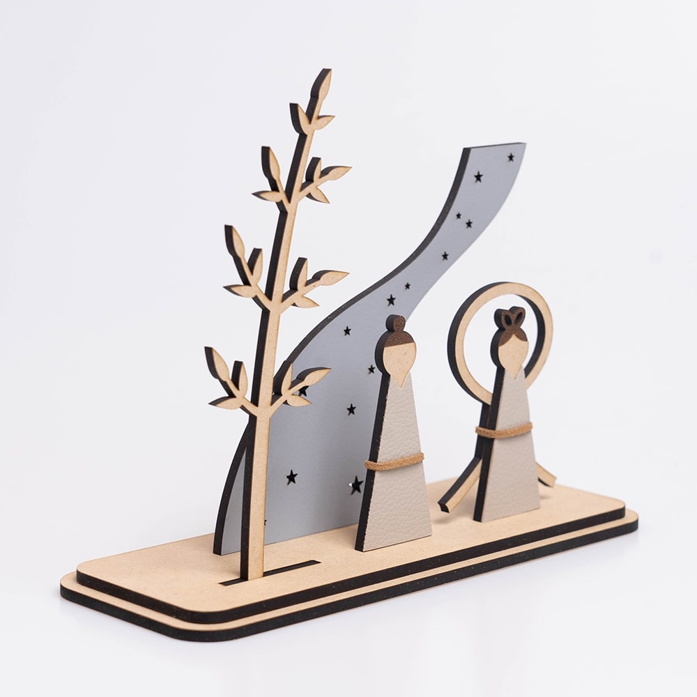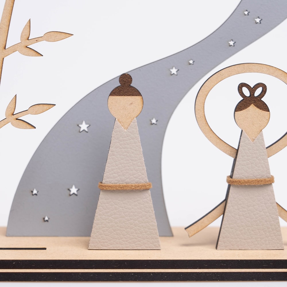 パステルカラーの七夕飾り 七夕の風情を繊細に表現した、特別な木製の置物です。 そよぐ竹のもと、織姫と彦星が出会う幻想的な情景を、グレーを基調としたローコントラストのやさしい色味と、シンプルなデザインで丁寧に仕上げました。 木(MDF)と合成皮革を組み合わせ、あたたかみのある風合いをお楽しみいただけます。 七夕のお祝いにはもちろん、お子さまの健やかな成長を願う贈り物としても最適です。 リビングや玄関に飾れば、季節感を添える上品なアクセントになります。