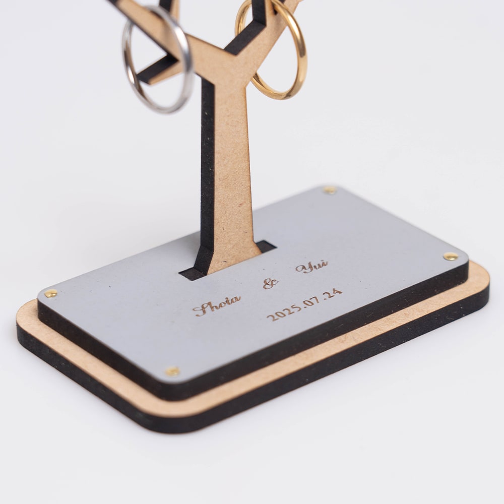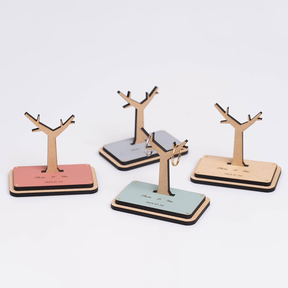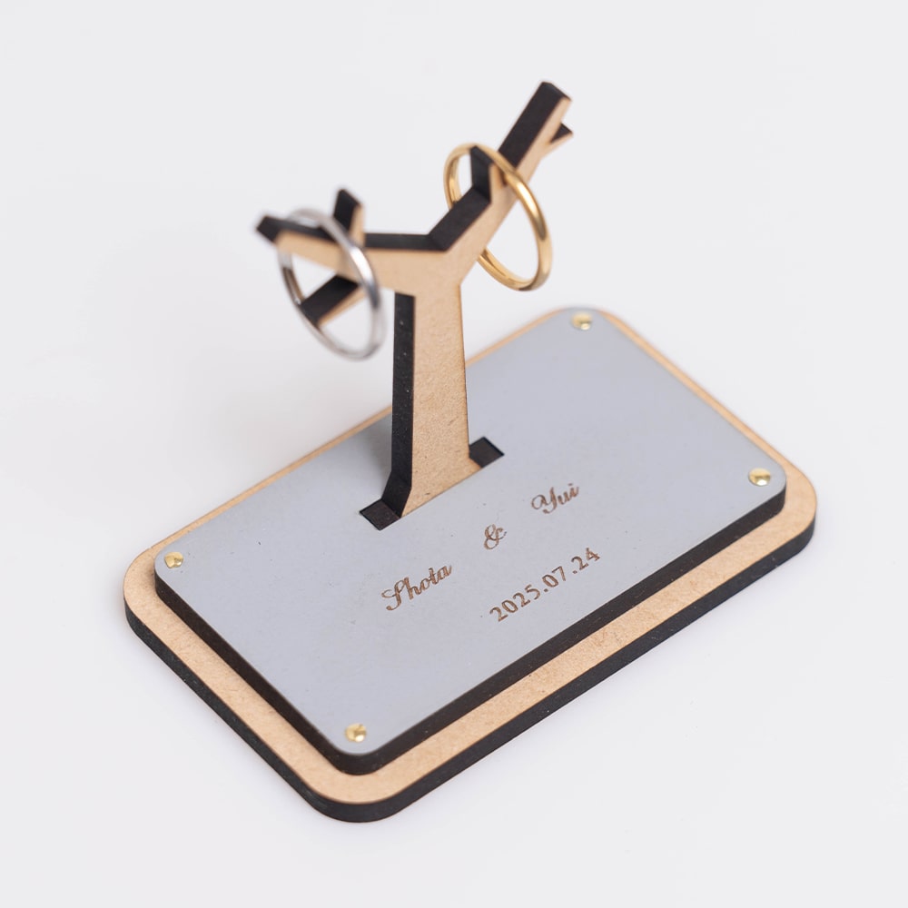 木の形をしたリングピロー 木のかたちをした、かわいいリングピローです。 木の枝に結婚指輪をそっと掛けて飾ることができ、特別な瞬間を可愛らしく演出します。 土台には、おふたりのお名前と記念日など、大切な日付を刻印することが可能です。